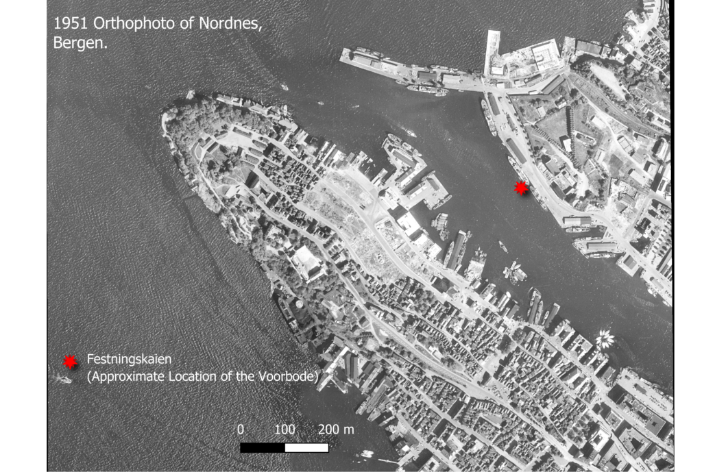 Towards the final years of Nazi occupation in Bergen, a Dutch vessel, the Voorbode, was carrying a large volume of dynamite and docked in Bergen harbour despite safety regulations that should prevent ships with such cargo docking so close to a city. In the early hours of the 20th April, the ship caught fire and ignited the dynamite onboard causing a large explosion. The resulting crashing waves and fires caused destruction over a kilometre in diameter around the Festning and Nordnes areas, with a part of the anchor shooting off and landing on the side of a mountain 3km away. You can read more about it here: https://www.bergenbyarkiv.no/bergenbyleksikon/arkiv/1424148?s=Eksplosjonskatastrofen